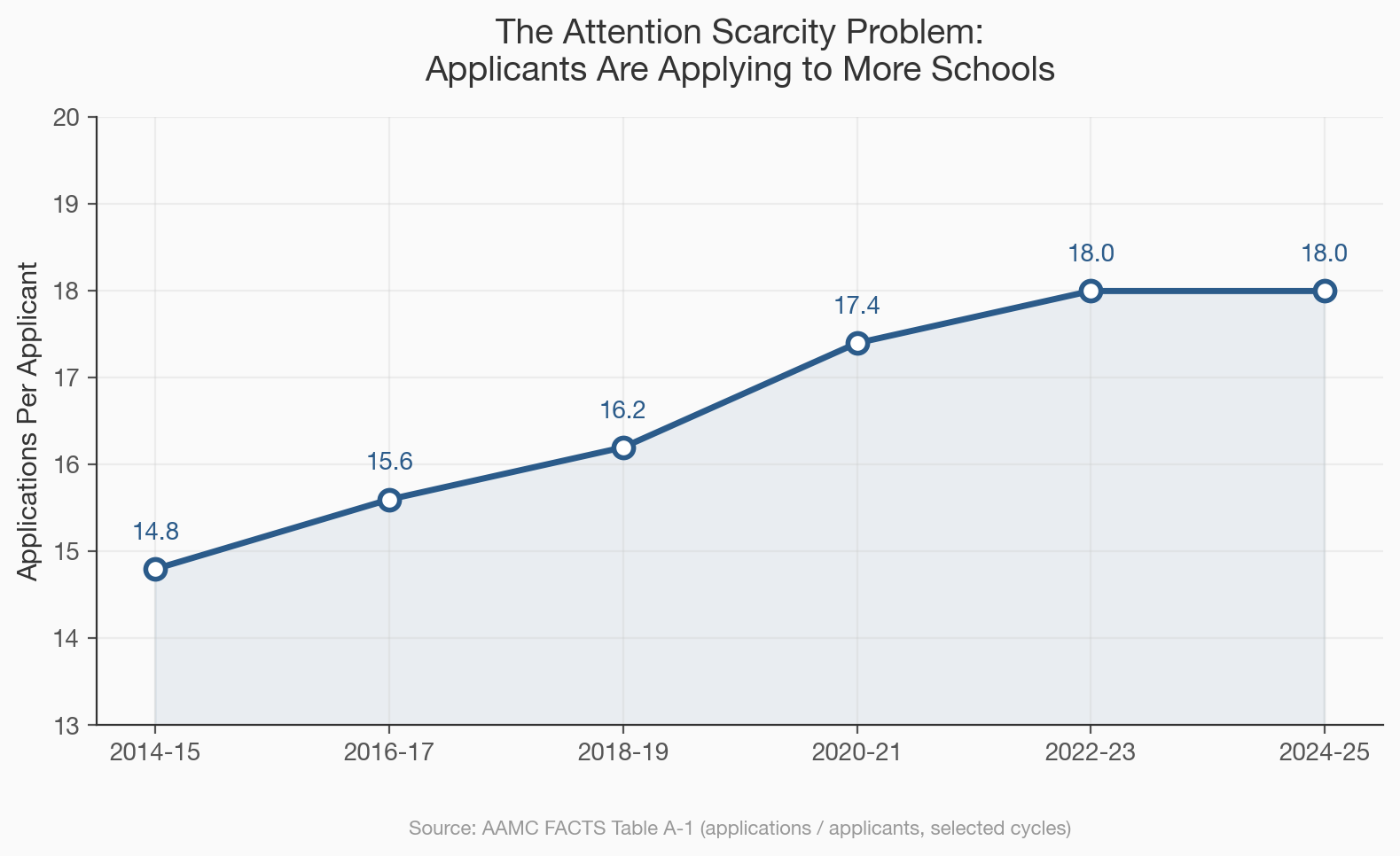 In the 2025 application cycle, 54,699 people applied to medical school in the United States, each submitting an average of 18 applications through AMCAS, a figure that has climbed steadily from the mid-teens over the past decade, which means that the total volume of application material landing on admissions desks has grown faster than the applicant pool itself, and the people reading those applications, the committee members who describe their process as “holistic review,” now face a mathematical problem that no amount of mission-statement language can solve: there are too many polished, qualified, carefully packaged applicants for the number of humans available to evaluate them, and when the reading load outpaces the reading capacity, committees do not become more thoughtful, they reach for shortcuts.