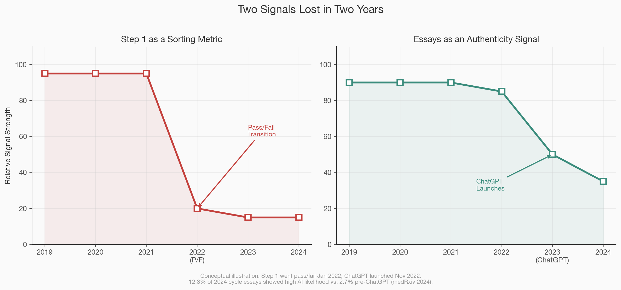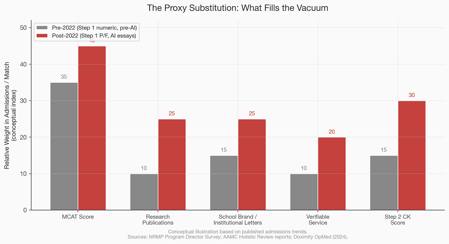 The first structural change came from downstream. In January 2022, USMLE Step 1, the board exam that medical students take after their second year, switched from a three-digit numeric score to pass/fail reporting, eliminating one of the most powerful sorting mechanisms in the residency match, the process by which medical school graduates are assigned to training programs. Step 1 scores had functioned for decades as a blunt but legible signal: a 250 told a program director something different than a 220, and competitive specialties like dermatology and orthopedic surgery used the score as a first-pass filter. When that number disappeared, program directors did not stop filtering, they substituted, shifting weight to Step 2 CK scores (which remain numeric), to research publication counts, to the prestige of the applicant’s medical school, and to institutional letters of recommendation whose credibility depends almost entirely on the reputation of the person signing them. A Doximity analysis found that the transition created what one author called a “new arms race” in research and extracurriculars, as students scrambled to replace the lost signal with other legible credentials, and residency programs, now unable to sort by Step 1, leaned harder on proxies that correlate with institutional access rather than clinical ability. The downstream blurring of one hard metric did not produce holism; it produced a vacuum that softer, more privilege-correlated proxies rushed to fill.